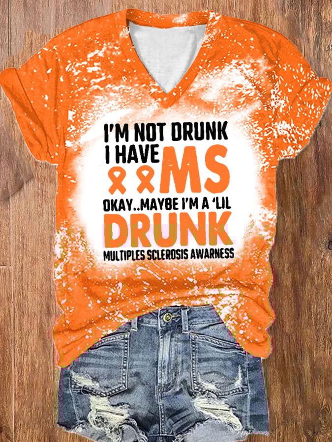 Women’s I’M NOT DRUNK I HAVE MS OKAY Multiple Sclerosis Awareness Tie-Dye Print V-Neck T-Shirt